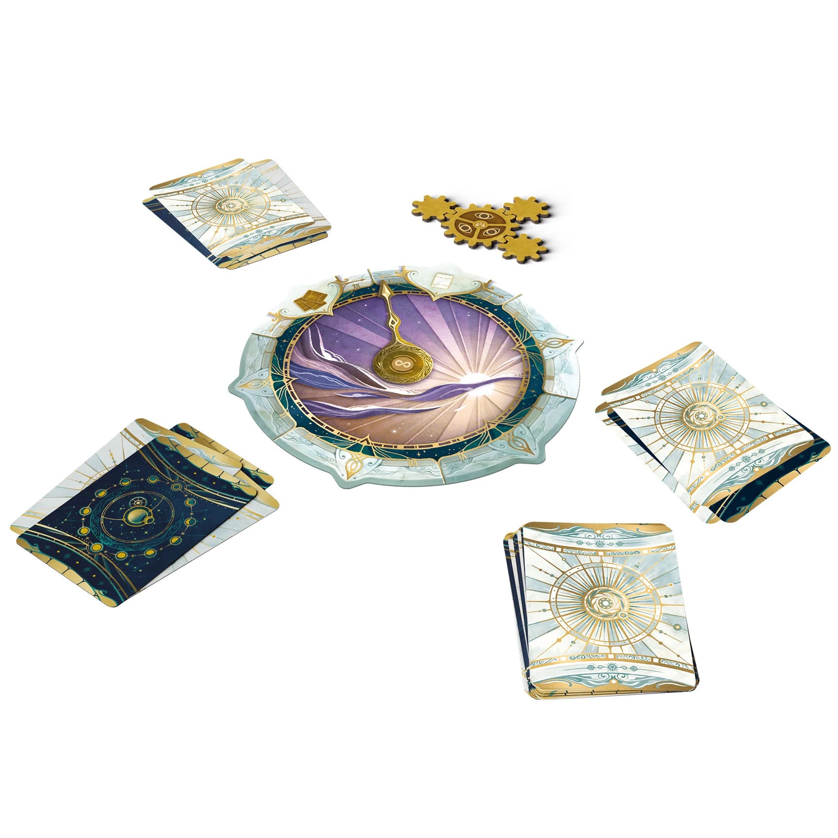 Take Time ist ein kooperatives Spiel, bei dem ihr die Rätsel verschiedener Uhren lösen müsst. Dazu spielt ihr 12 Karten verdeckt um die Uhr herum. Ihr wisst, wie die Karten am Ende verteilt sein müssen, aber ihr wisst nicht, was die anderen gespielt haben und dürft euch nicht unterhalten.